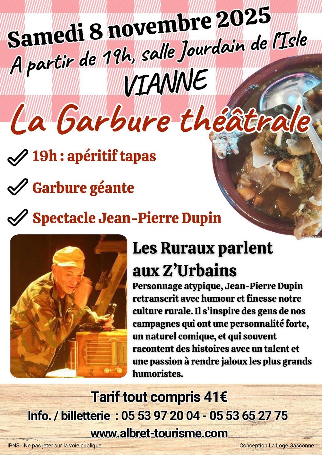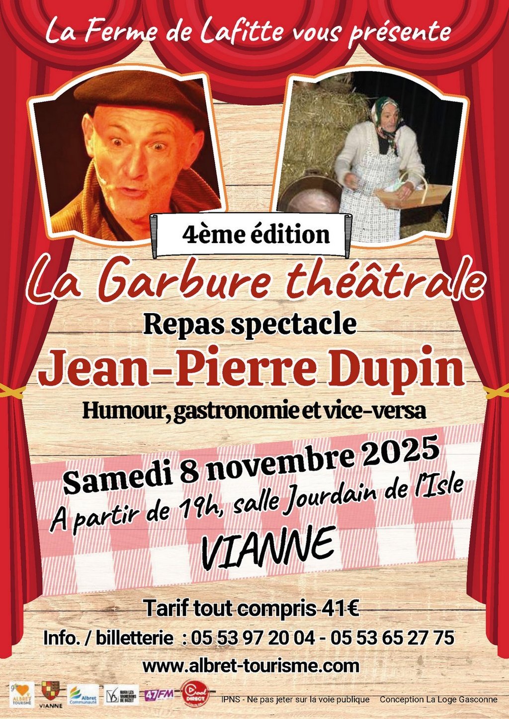 La Ferme de Lafitte et l'humoriste Jean-Pierre Dupin vous invitent à une garbure théâtrale exceptionnelle le samedi 8 novembre. Après un apéritif tapas à 19h, vous allez savourer un délicieux repas du terroir autour d'une garbure géante. Jean-Pierre Dupin, avec son humour irrésistible, vous plongera dans l'univers de nos campagnes à travers son spectacle "Les ruraux parlent aux z'urbains", un hommage drôle et touchant à la culture rurale. Laissez-vous charmer par ce moment convivial et plein de rires !