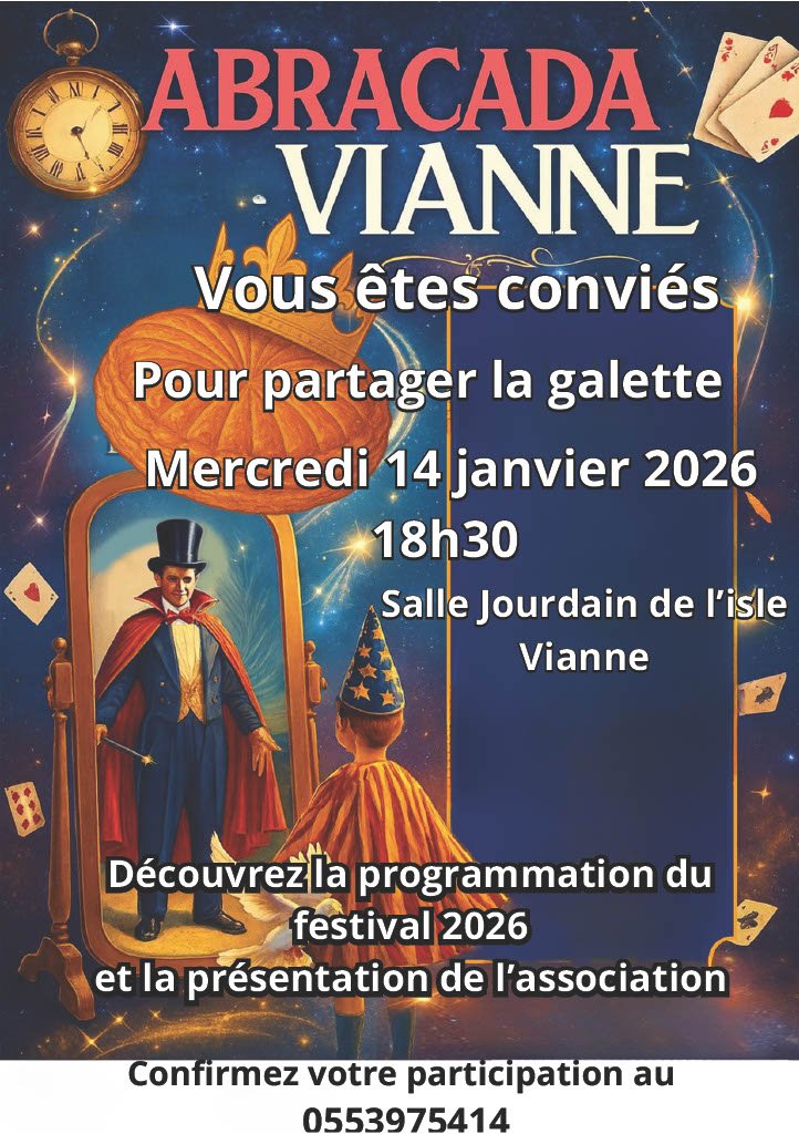 Nous avons le plaisir de vous inviter à un moment convivial autour d'une galette, le mercredi 14 janvier à 18H30 à la salle Jourdain de L'Isle à Vianne.